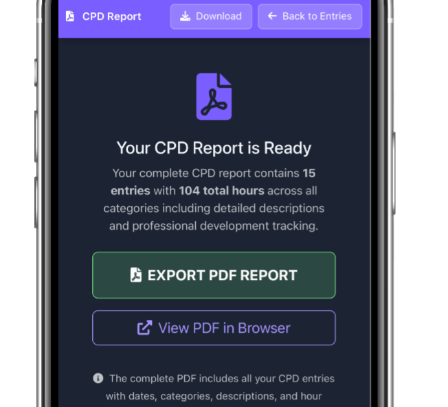 Easily export your CPD logs and reports for your professional needs.