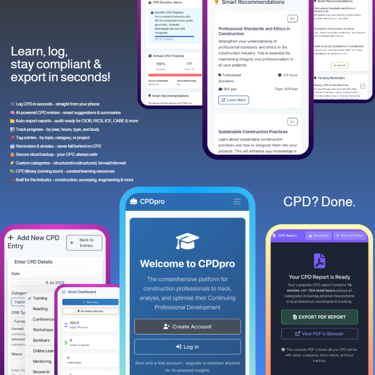 At Caradon AI Ltd, we are dedicated to providing construction professionals with an innovative platform for CPD tracking and logging. Our app CPDpro not only allows you to efficiently log your hours but also assists in finding the right training through AI-driven recommendations.